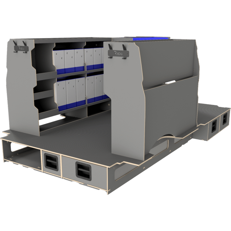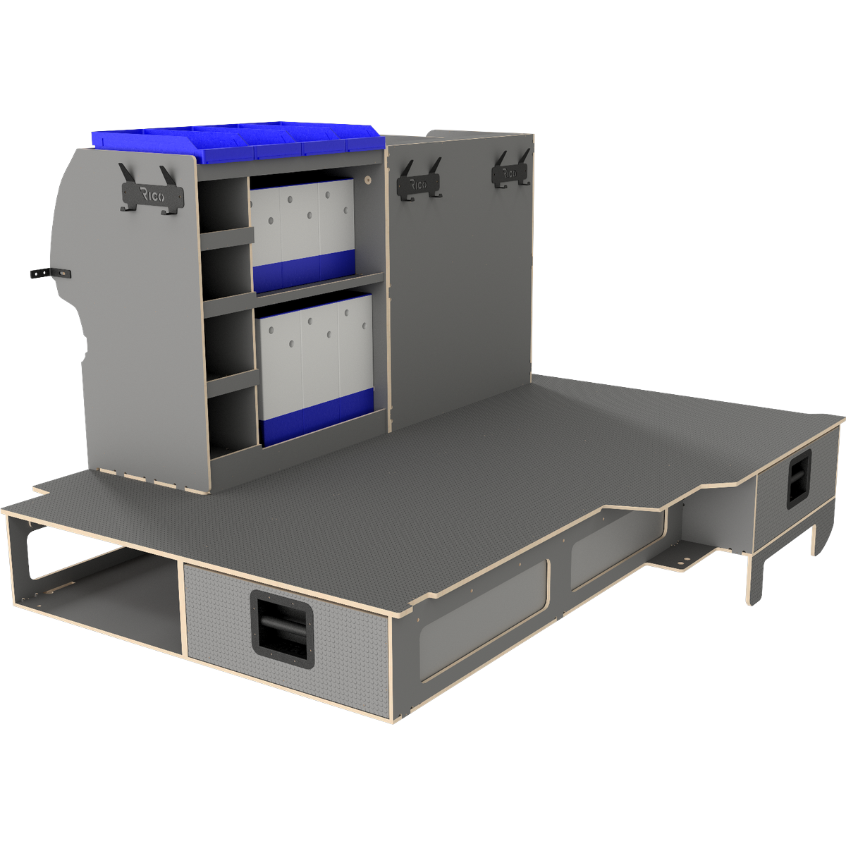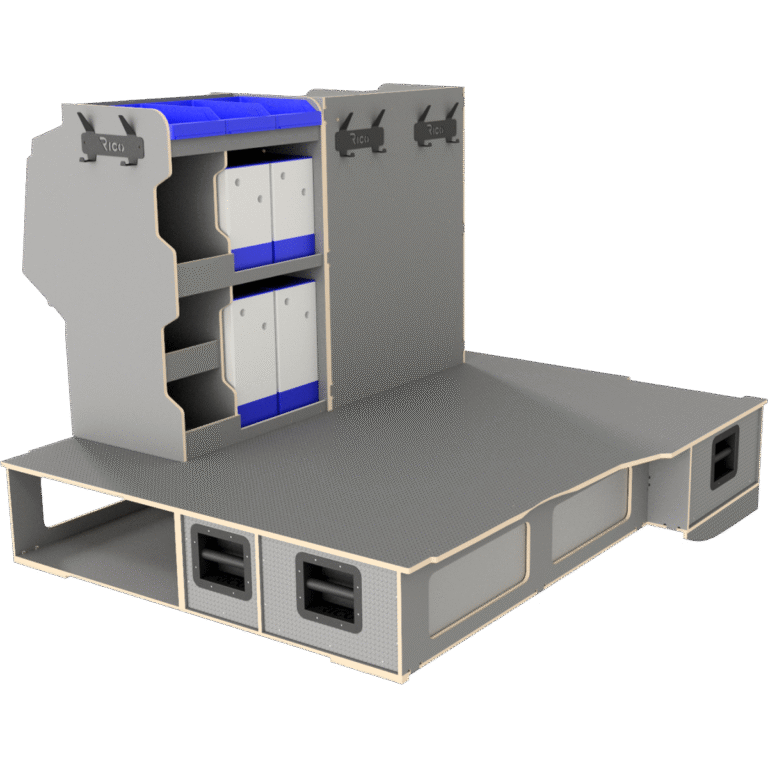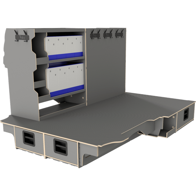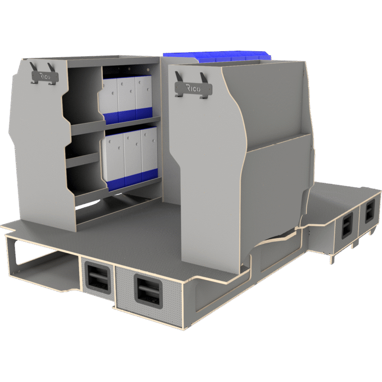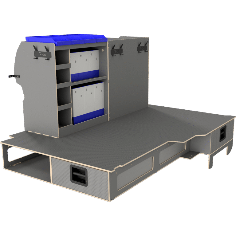 Vi har derfor designet vores hævet dobbeltgulv hvor lange skuffer giver let adgang til materialer og det at vi altid anbefaler skydedøre i begge sider af bilen, der gør, at brugeren aldrig skal ind i bilen.