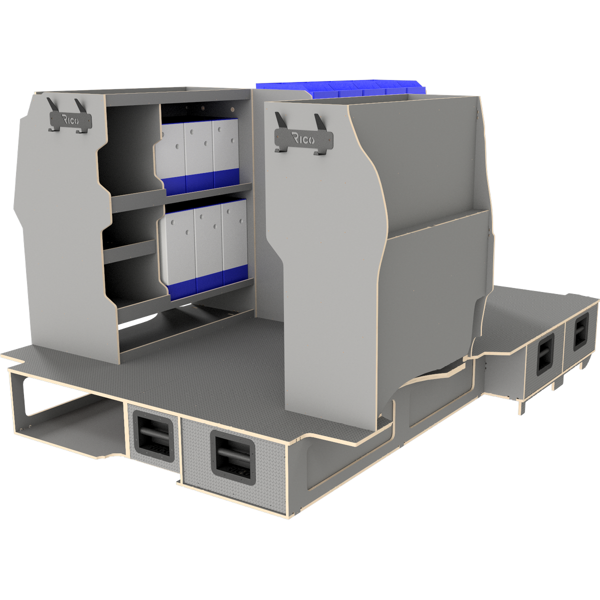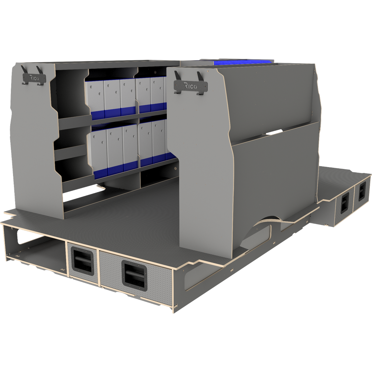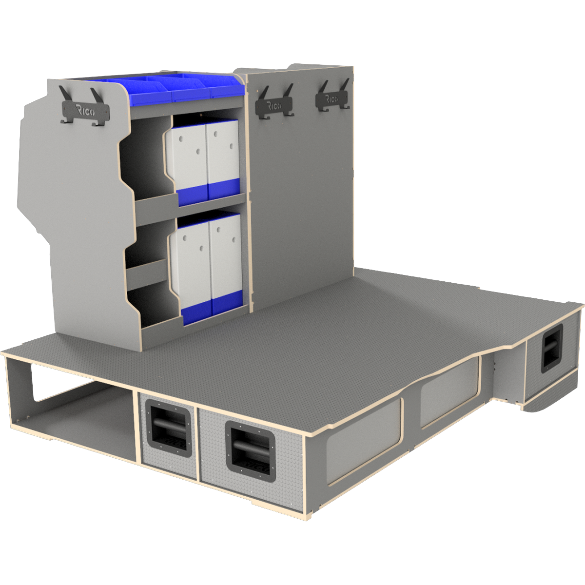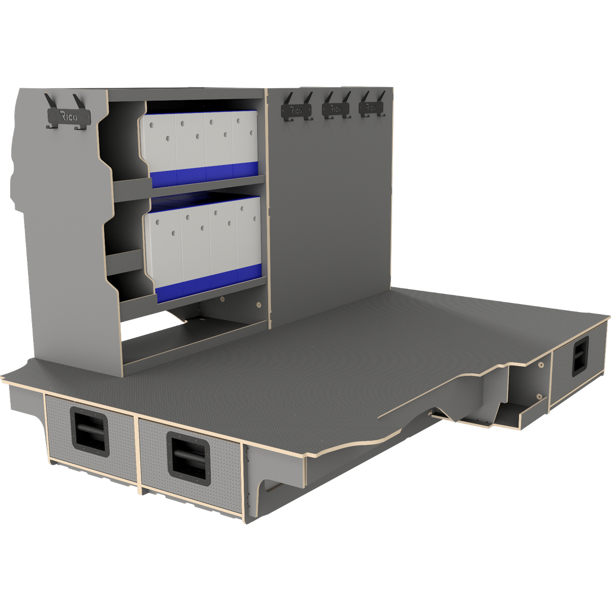 Vi har derfor designet vores hævet dobbeltgulv hvor lange skuffer giver let adgang til materialer og det at vi altid anbefaler skydedøre i begge sider af bilen, der gør, at brugeren aldrig skal ind i bilen.