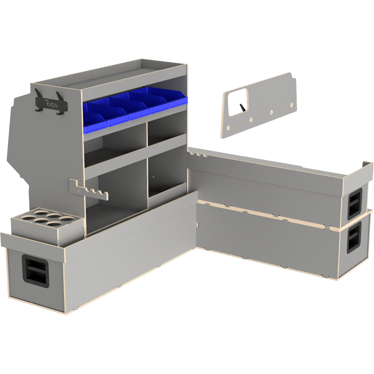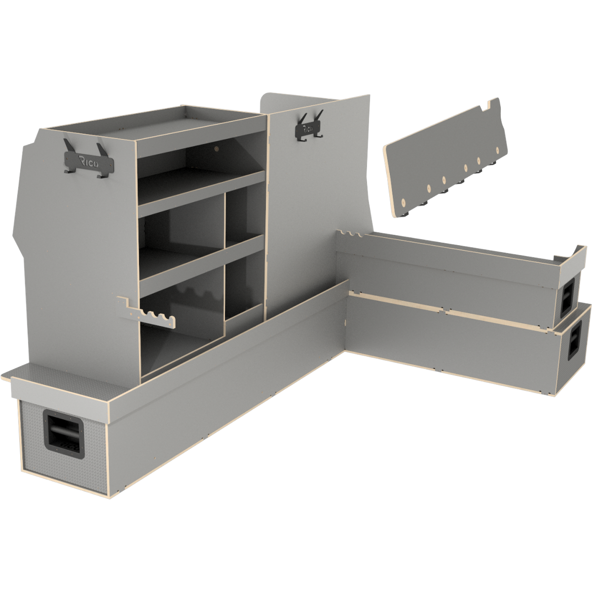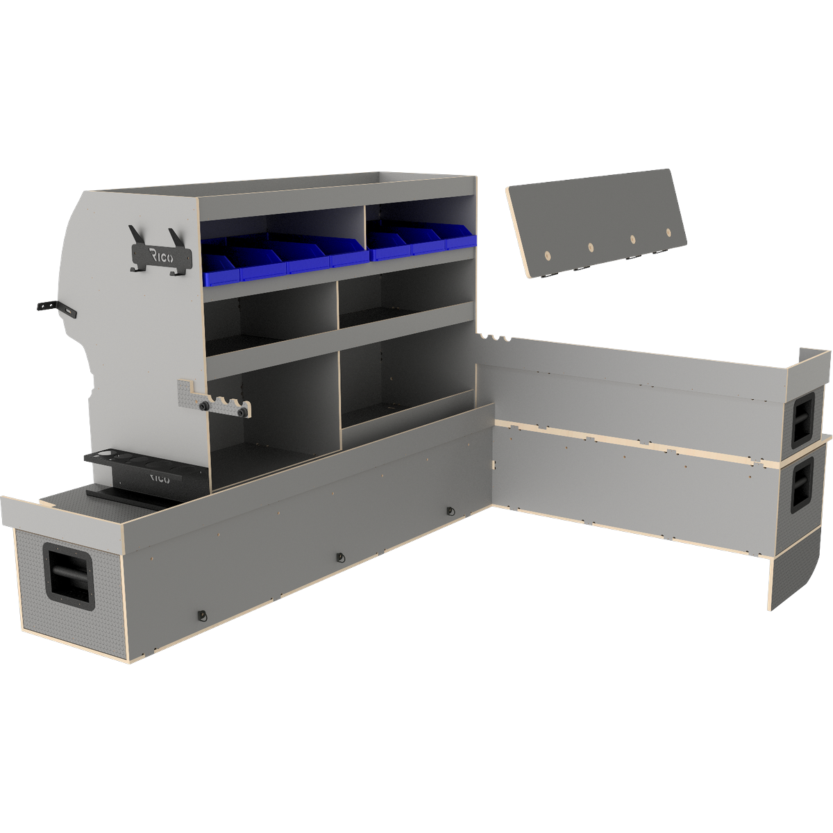 Nous avons donc conçu notre double plancher surélevé où de longs tiroirs facilitent l'accès aux matériaux et nous recommandons toujours des portes coulissantes des deux côtés du véhicule afin que l'utilisateur n'ait jamais à entrer dans le véhicule.