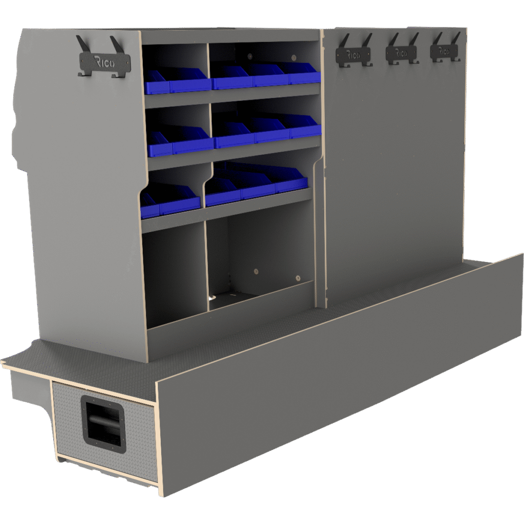 Raaco-kuffert vist på billedet i reolen foran til venstre er ekstraudstyr og skal bestilles separat.