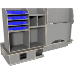 Innredningen leveres ferdig satt sammen i moduler og består av: