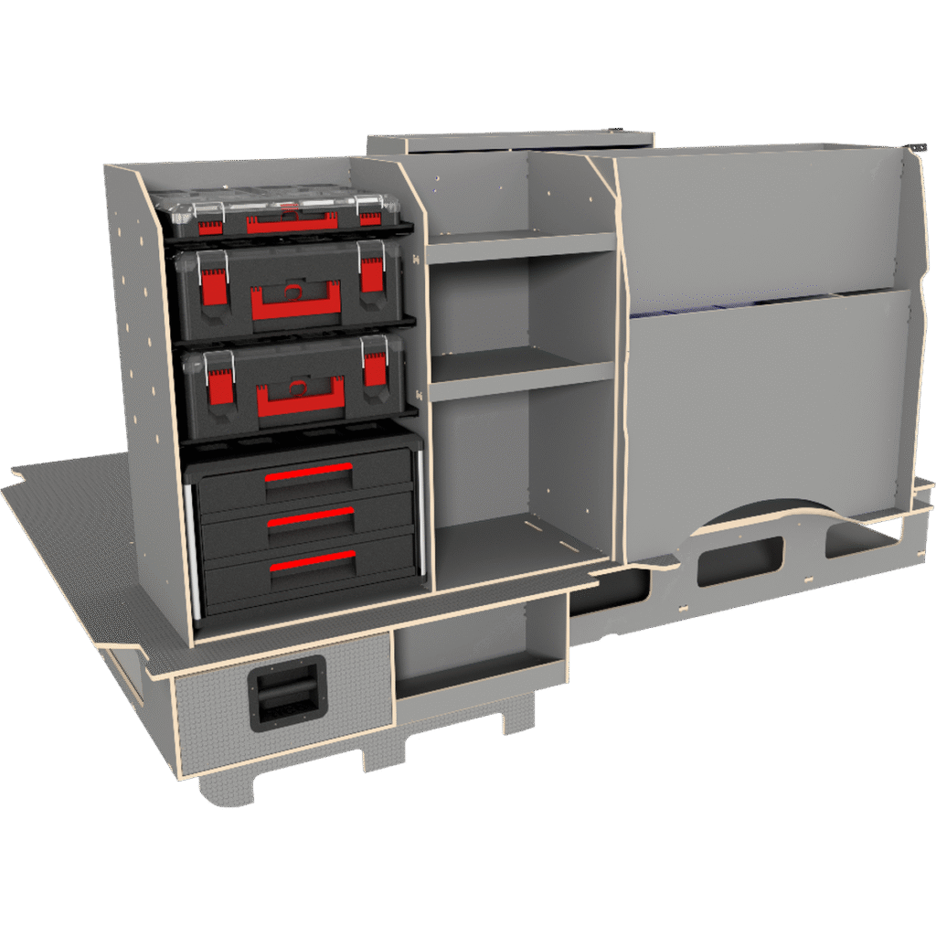 Vi har derfor designet vores hævet dobbeltgulv hvor lange skuffer giver let adgang til materialer og det at vi altid anbefaler skydedøre i begge sider af bilen, der gør, at brugeren aldrig skal ind i bilen.
