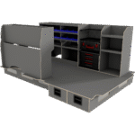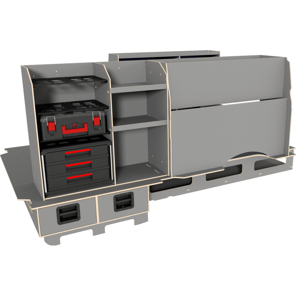 Vi har derfor designet vores hævet dobbeltgulv hvor lange skuffer giver let adgang til materialer og det at vi altid anbefaler skydedøre i begge sider af bilen, der gør, at brugeren aldrig skal ind i bilen.
