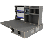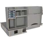 Vi har derfor designet vores hævet dobbeltgulv hvor lange skuffer giver let adgang til materialer og det at vi altid anbefaler skydedøre i begge sider af bilen, der gør, at brugeren aldrig skal ind i bilen.