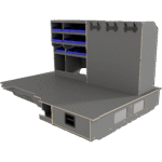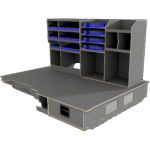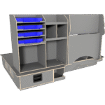 Vi har derfor designet vores hævet dobbeltgulv hvor lange skuffer giver let adgang til materialer og det at vi altid anbefaler skydedøre i begge sider af bilen, der gør, at brugeren aldrig skal ind i bilen.
