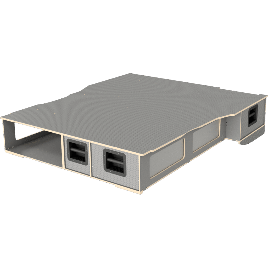 Vi har derfor designet vores hævet dobbeltgulv hvor lange skuffer giver let adgang til materialer og det at vi altid anbefaler skydedøre i begge sider af bilen, der gør, at brugeren aldrig skal ind i bilen.