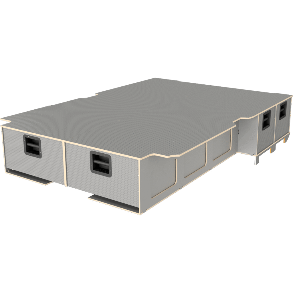 Vi har derfor designet vores hævet dobbeltgulv hvor lange skuffer giver let adgang til materialer og det at vi altid anbefaler skydedøre i begge sider af bilen, der gør, at brugeren aldrig skal ind i bilen.