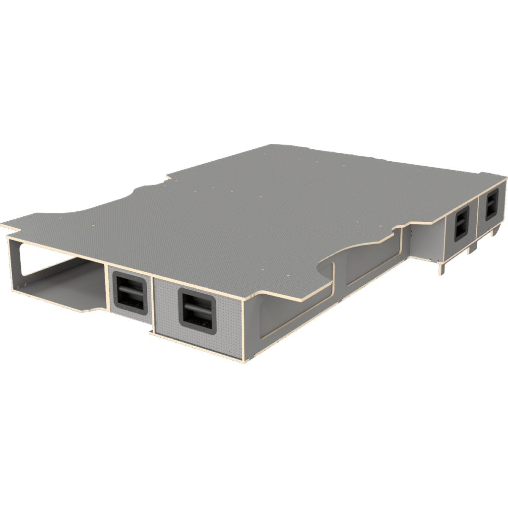 Yderligere giver dobbeltgulvet et lavt tyngdepunkt og en sikker og behagelige køreoplevelse. Krydsfineren har ingen skarpe kanter og er temperaturneutral og behageligt at røre ved med bare hænder.