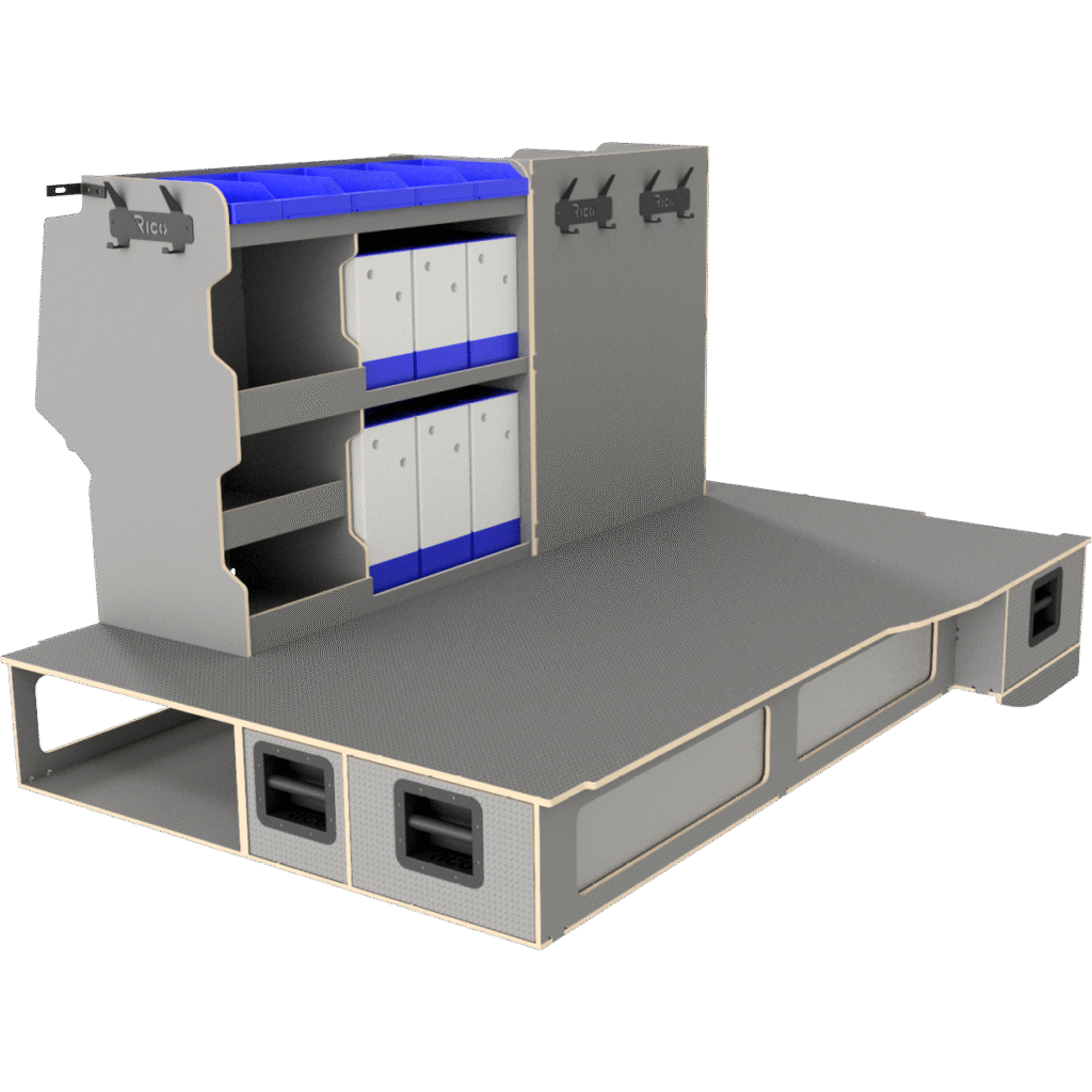 Vi har derfor designet vores hævet dobbeltgulv hvor lange skuffer giver let adgang til materialer og det at vi altid anbefaler skydedøre i begge sider af bilen, der gør, at brugeren aldrig skal ind i bilen.