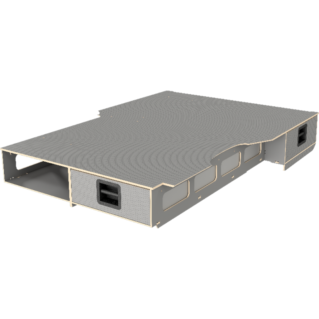 Vi har derfor designet vores hævet dobbeltgulv hvor lange skuffer giver let adgang til materialer og det at vi altid anbefaler skydedøre i begge sider af bilen, der gør, at brugeren aldrig skal ind i bilen.