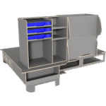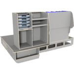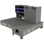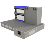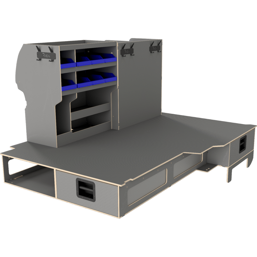 Vi har derfor designet vores hævet dobbeltgulv hvor lange skuffer giver let adgang til materialer og det at vi altid anbefaler skydedøre i begge sider af bilen, der gør, at brugeren aldrig skal ind i bilen.