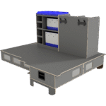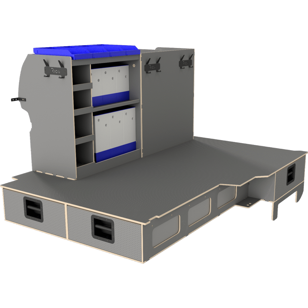 Vi har derfor designet vores hævet dobbeltgulv hvor lange skuffer giver let adgang til materialer og det at vi altid anbefaler skydedøre i begge sider af bilen, der gør, at brugeren aldrig skal ind i bilen.