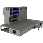 Vi har derfor designet vores hævet dobbeltgulv hvor lange skuffer giver let adgang til materialer og det at vi altid anbefaler skydedøre i begge sider af bilen, der gør, at brugeren aldrig skal ind i bilen.